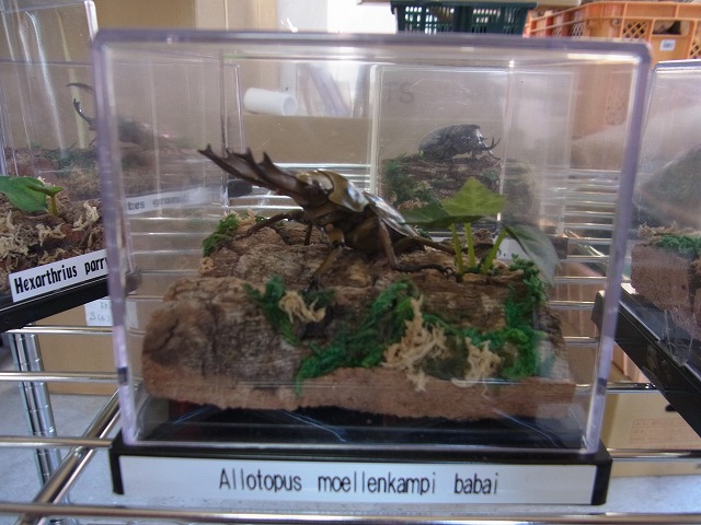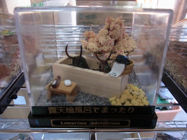 私のお勧めは題名が「露天檜風呂でまったり」のパプアキンイロクワガタが気持ちよさそうにお風呂に入っている標本です。